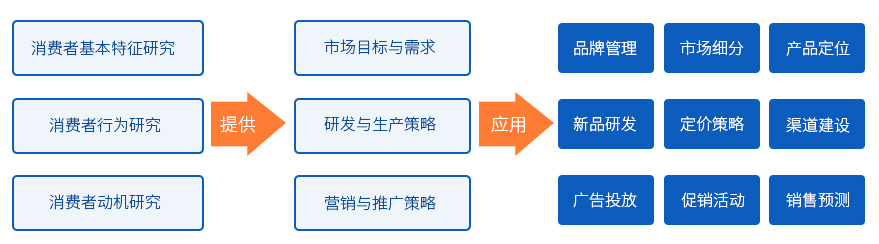 消費者研究是市場調研領域應用最多的消費品市場研究的一個最基礎、主要的組成部分,包括消費者基本特征研究、消費者行為研究、消費者動機研究三大部分。通過這三個層面的研究,為相關行業和企業提供:市場細分、產品定位、品牌管理、定價策略、新品開發、渠道建設、廣告投放、促銷活動、銷售預測等行為的理論、數據基礎。